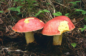 | [特 徴] 傘は美しいバラ紅色で、はじめは半球系、後にはほぼ平らに開く。孔口は淡黄色で傘が開ききると褐色がかり、傷つくと青変する。 柄は淡黄色で細かい網目におおわれる。根もとは青紫色になる場合もある。 |