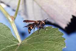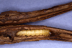この幼虫の寄生を受けた枝はその部分が太くふくらみ、それより先の部分を枯死させるブドウ害虫としても知られるが、通常、防除の行き届いたブドウ園よりも野生のエビヅルのほうが寄生率が高く、