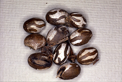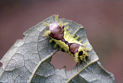 採集はこうしたコブ状にふくらんだ枝をさがせばいいのだが、われわれがそれを集めても中の幼虫の有無や生死は枝を裂いてみなければわからないことが多い。しかし、 購入した枝から死んだ幼虫が見つかることはほとんどないことに驚く。採集人たちが今で言う「非破壊検査」をどうやって行っているかはナゾである。 成虫のガはハチにそっくりな形をしていて、「擬態」の例として有名である(写真B-3)。もちろん刺すことはできないが、それでもつかむと腹を曲げて刺すマネまでする。 なお、田中誠氏によれば、この幼虫は釣り餌のほかに江戸の武士階級に流行したウグイスやメジロなどの飼い鳥の餌として用いられ、徳川吉宗(1684−1751)のころから近在の農村は毎年、 将軍家から「エビヅルムシ」の上納を強制され、たいそう苦労したと伝えられる(注4)。 また、近年「養殖ぶどう虫」「バイオぶどう虫」などのまぎらわしい名の釣り餌が出回り、むしろこちらのほうが主流になっているが、これは別項の「養殖もの」で後述するように、 ハチミツガというまったく別のガの幼虫である。 イラガ Monema flavescens (写真C-1〜3)
