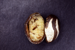 イラガの幼虫は、カキの木やサクラの木などの庭木に多い有数の「刺す毛虫」で、うっかり刺毛に触れると電撃的な激痛が走る(写真C-3)。しかし、マユの中で越冬中の終齢幼虫は、体が白く縮み、 刺毛もフニャフニャになってもはや人を刺す実力はなくなる(写真C-2)。あちらの世界のイラガはこの越冬幼虫まで人を刺すらしい。 ボクトウガ Cossus jezoensis (写真D-1・2)