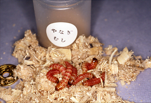 ネコヤナギの枝に潜入している幼虫を集め、主としてウグイやニジマスなどの渓流魚用に販売。幼虫10匹を木屑とともに容器に入れて300円。ボクトウガは各種の樹木の枝幹部を加害し、
