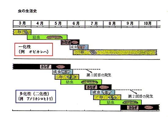昆虫類の一生(1世代)は卵から成虫まで育ち、次代の卵を産むまでです。種類によってこれを1年の間に1回しかくり返さないものや2回以上くり返すものがあります。