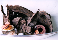 薄い板、すきまの多い石など腐りにくい材料ならば何でもかまいません。とくに熱帯魚用に売っている「流木」(海岸に漂着した空洞やでこぼこに多い木材で木〈ぼく〉と呼ばれています)