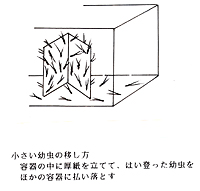 幼虫の移し替えは紙を二つ折りしたものを入れてやるとこれに這い上るので、それを新しい容器に払い落とす方法を繰り返します。最後に取り残した幼虫は吸虫管で吸い取ります。