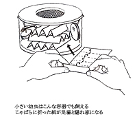 幼虫が孵化したら、脱皮するときの足場のために画用紙などの厚手の紙をじゃばら状に3〜4cm幅に交互に折ったものかまたは流木や板だけを入れた新しい容器に移します。