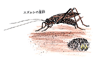 スズムシの成虫は体長2センチほどの黒い虫です。雄はその名のように、「リーン・リーン」という鈴をふるような声で鳴き、なれれば野外でも声を聞き分けることができます。