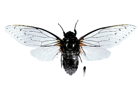 世界最大のセミで、鳴き声は食用蛙(ウシガエル)に似る。 右下の小さいセミはマレー半島産の超小型のセミ(種名不詳)、 体長15mm。 |