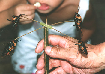 オサゾウムシを売る子供たちと竹へのとりつけ方(右隅)
