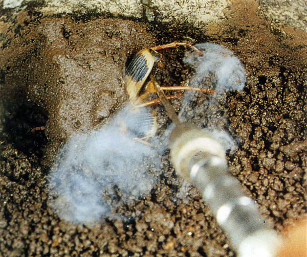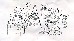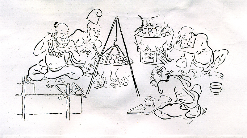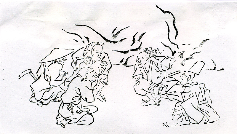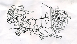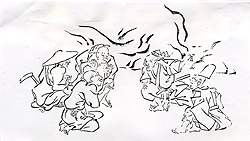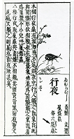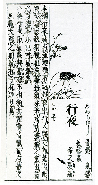 「ミイデラ」の語源のナゾこの欄の73回目で「ヘッピリムシ(放屁虫)」の話を書き、その正体がミイデラゴミムシという小甲虫で、刺激を受けると腹端から爆発音とともに悪臭を発射することや、ミイデラの語源が不明であることなどを紹介した。いっぽう、中国で明代の16世紀に李時珍によって著わされた有名な『本草綱目』は、17世紀はじめに長崎に渡来し、家康に献じられ、これが江戸時代を通じての日本の本草学の原典となった。 そして多くの国産の動植物がこの本を元に"同定"された。ミイデラゴミムシも例外ではなく、この本の中で、「夜行性で、触ると臭いを出し、ゴキブリに似る」と記載されてあった「行夜(こうや)」という虫がそれであるとされた。 さらに寺島良安はその著書『和漢三才図会』(正徳3年<1713>)で、「行夜」の俗名として「へひりむし」を挙げ、「ゴキブリとは似ていない。触れると音を出して屁をひり、大変臭い」と記している(図)。 なお、『本草綱目』の「行夜」の正体についてはトウヨウゴキブリとする説があるという(荒俣、1991)が、その出典は定かではない。 この臭い虫に「ミイデラ」という名が冠されたのは、小野蘭山の『本草綱目啓蒙』(享和3年<1803>)が最初らしく、「行夜」の別名として、「ヘコキムシ」「ヘヒリムシ」「カメムシ」と並んで「三井寺ハンメウ」と記されている。 また、「ハンメウ」の名は、これをハンミョウ科の甲虫と誤認したためであるが、そのまま「ミイデラハンミョウ」の名は訂正されることなく近代まで「コウヤ」とともに用いられた。そして、 昭和7年(1932)刊行の『日本昆虫図鑑』(北隆館)においてようやく「みいでらごみむし(新称)」と改称された。 ところで、前報で触れたように、この虫につけられた「三井寺」については、語源不明とされていたが、ぼくはかねてこの真相が気になり、足の裏に飯粒が付いたような気分が心の片隅に残っていた。 語源は絵巻『放屁合戦』ところが最近、たまたまある会合でゴミムシ類の専門家である滋賀県立琵琶湖博物館の八尋克郎氏にお会いし、たいそう興味深い話を伺った。つまり、大津市の三井寺は昔たくさん寺があった一帯の地名で、 この地で一番の大寺に「円満院門跡」がある。この寺は歴代の門主に高僧を輩出し、鳥羽絵の始祖で国宝の『鳥獣戯画』の作者で知られる鳥羽僧正もその一人であった。そうした関連から、 この寺の付属の「大津絵美術館」には各種の鳥羽絵が残されていて、その代表作品のひとつに『放屁合戦』という絵巻物があるという。八尋氏によると、実物は横幅45cmほどの20枚の絵が横につながった全長9mに及ぶ絵巻物で、 末尾には、「狩野近信所蔵のものを、寛保3年(1743)に鳥羽僧正の末流である権僧正の盤松という僧侶が写した」旨の添え書きがある由である。この絵巻は、抜粋した複製が円満院門跡から魔除けのみやげものとして販売されていると聞き、早速注文したところ、肉筆筆書きの立派な送り状と由来記を添えて現物が届いた。それは縦15cm、 横14cmの方形の折本に半数の10面が抜粋複製されたミニチュア版で、価格は3千円であった(写真)。また、由来記によれば、「鳥羽絵のなかでももっとも愉快なものにして、放屁の模様を合戦風に巧みに見立てた、 軽妙・洒脱・風流な絵なり。とくに古来より悪魔退散魔除けとして知られる」とある。八尋氏によれば、原本では巻頭から2枚目までの絵は、まず合戦に臨み秘策を練る図で、3〜5枚目は腹ごしらえの図。 ついで6枚目からは両者東西に分かれてのさまざまな趣向によるはなばなしい放屁合戦の模様が終わりまで延々と続くという。ただし、この絵巻には勝負の決着がない。これについて由来記は言葉を続ける。 「各様式に従い会戦の運び、いずれが勝ちにて候や、いずれが負けにて候や、勝ち負けは聞きもらし候ことなれど、合戦が放屁とも相成れば、いずれ霧散し果てしものと存ずる」と。 結局、八尋氏との話で、「ミイデラ」の名前の由来はおそらくこの絵巻だろうということになった。名付け親(小野蘭山?)が、かねてこの絵巻物の存在を知っていて、 「コウヤ」のオナラの習性と結びつけて命名したことはいかにもありそうな話である。ぼくの勧めもあって、八尋氏は早速周辺の関連事項まで詳しく調査して甲虫類関係の雑誌に発表し(八尋、2004)、 この小文もそれによるところが大きい。ぼくもまた、八尋氏のおかげでようやく足の裏の飯粒がとれた気分である。 (引用文献)荒俣 宏(1991)『世界大博物館I蟲類』、平凡社 八尋克郎(2004)ミイデラゴミムシの語源、地表性甲虫談話会会報、第1号 [「虫けら賛歌」より改変、2009、創森社] |