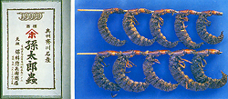 長さ10センチの竹串に5匹ずつ串刺しにしたもの10串、合計50匹を紙箱または桐箱に納めたもので、一箱 2,500円、1匹50円の勘定である(図6)。