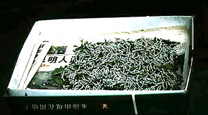 箱に入れた4齢とおぼしい一群のカイコである。しばらく見ていたら、小箱を手にしたかわいい少女がやって来て、小ゼニで1元(約16円)を払い、