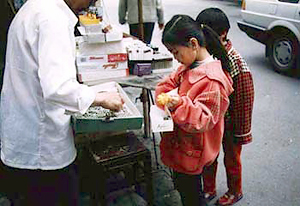 露店のおやじがカイコを慎重に10匹数えて小箱に移した。このあたりに養蚕地帯はない。通訳を通じて少女に「そのカイコをどうするのか」と尋ねたところ、