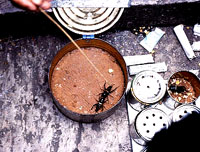 闘いは、2匹のコオロギを大鉢の“競技場”に入れて行われる。棒につけたネズミのヒゲでコオロギを刺激して怒らせると、口で咬(か)み合うケンカになり、 逃げたり飛び出したりした方が負けになる。重量制の採用など、複雑なルールも定められ、子供までそれなりの金を賭(か)けて熱中したという。 当然、関連の道具類も華麗に進化し、高級なものはまさに芸術品の域に達している。前述の容器もその一つで、同類は映画「ラストエンペラー」にも登場している。