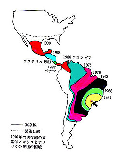 アフリカ品種は勤勉と引きかえに気性が荒く、その性質が遺伝的に優性だったために、イタリア品種との交配でますます狂暴になってしまったのである。 思いがけない“暴れバチ”の誕生と、相つぐ人畜への被害のニュースは世界をかけめぐり「スウォーム」という映画が作られたり、朝日新聞でも大きく報じられた。 暴れバチはまた移動力が大きく、各地でイタリア品種と置き換わりながら勢力を拡大し、1985年にはついにパナマにまで達した。 この地峡地帯ではさまざまな北上阻止の方法がとられたが、最近ではメキシコに侵入し、アメリカ本土への侵入がますます深刻に憂慮されているという。 とにかく暴れバチの侵入は、その危険性もさることながら、意欲の喪失による養蜂業の壊滅の方がもっと恐れられている。ただ、このハチは出身地を反映して寒さに弱く、 それが北上ストップへの期待ともなっている。さいわい日本は地理的にも気候的にも、申し訳ないが当面は“対岸の火事”である。 [朝日新聞夕刊「変わる虫たち」,(1989.2.20)] |