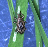 1976年、愛知県下の水田で、イネの葉をカスリ状に食害している見慣れない小甲虫がみつかった。調査の結果、アメリカ原産のイネ害虫で、輸入干し草に成虫が潜んで密入国したらしいことがわかり、