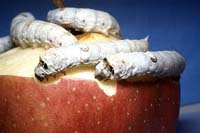 一方、農水省の蚕糸・昆虫農業技術研究所の保存する、膨大なカイコの品種の中に、マユが小さく実用性は乏しいものの、一時的にはリンゴやキャベツからカステラまで“何でも食う”系統がある。 そして、その遺伝子を実用的なカイコの品種に導入することに成功した。もっとも、これらのエサは栄養的には不満足で、“生ゴミだけで育つカイコ”というわけにはいかないが、 人工飼料ならば栄養面はどうにでもなる。 かくして、絹の再評価が高まる風潮の中で、“何でも食うカイコ”と“低コスト飼料”の歩み寄りによる矛盾の解決に、大きな期待が寄せられている。 [朝日新聞夕刊「変わる虫たち」,(1989.4.11)] |