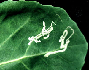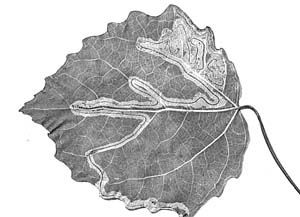 街角でいつか東京の盛り場で人だかりがしていた。ぼくは、いつものように人をかき分けてのぞき込んだ。たまげたことに、そこでは、フンドシひとつの若い男が、 自分のからだに絵の具をぬりたくり、大きな白布の上をのたうちまわっていた。前衛絵画の創作中とのことであった。ぼくにもできる−−と思ったことはさておいて、 もし、これが芸術であるならば、虫にだって前衛画家はいる。エカキムシミカン若葉を食害するエカキムシという害虫がある。幼虫が葉の中にもぐり込んで、くねくね曲がった孔道を掘りながら葉肉を食べて成長する。 食痕は表皮を残して白くすけて見える。それがちょうど葉面に絵を画いたように見えるのでエカキムシ(正しくはミカンハモグリガ)と呼ばれている。木や草の葉に絵を画く虫はほかにもたくさんあり、これを総称してハモグリ類、または潜葉性昆虫と呼んでいる。主としてガや甲虫やハエの仲間に多くの例が見られるが、 なんといってもあのうすい葉にもぐり込むので、そのからだは小さく、一般に偏平なからだつきをしている点が特徴的である。