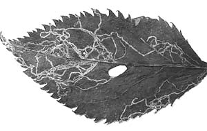 ハモグリ類は、種類によってその寄生植物がだいたいきまっていて、何百種類もの植物にまたがるようなものはめったに見当たらない。たいていの植物は押葉にしても食痕がはっきり残るので、 その気があれば面白いコレクションができるだろう。 なぜ?葉にもぐるという特異な性質が成立した経緯については、地史的な時間をさかのぼらなければわからない。ぼくのタイムマシンはまだ試作の段階で、 残念ながらこれに明快な解答を出すことはできない。しかし、近年、果樹害虫としていろいろなハモグリ類(主としてガの仲間)が増加傾向にあり、 今や大害虫となっているナシのナシチビガやリンゴのキンモンホソガなども、問題になりはじめたのは比較的近年のことである。このため、 その生態研究も活発になりつつあり、一部の種類では、幼虫期の初期死亡率が一般の昆虫に比べてかなり低いことがわかっている。少なくとも葉にもぐるという性質は、 天敵の攻撃に対する防衛に相応の役をになっていることはたしかなようである。また、一枚の葉に複数の幼虫がもぐり込んだ場合、おたがいの孔道はめったに交わらない。 なにを手がかりに相手の存在を認知しているのかはわからないが、このようなともだおれの防止機構も見事というほかはない。ハモグリ類は葉上の絵によってだいたいの種類がわかる。高名な画家の作品のように。 [みのりの仲間,No.4(1977)] |