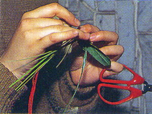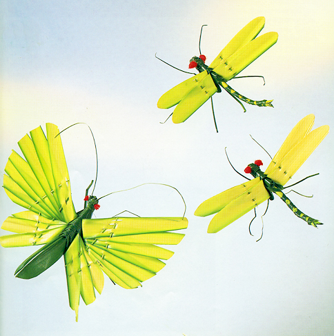 彼女は北京出身の医学留学生で30歳くらい、中国伝統の草編み技術を継承し、ススキやキミガヨランの一種の生葉を使い、目の前で4種の虫(写真のほかにカマキリ・バッタ)をみごとに編み上げる。