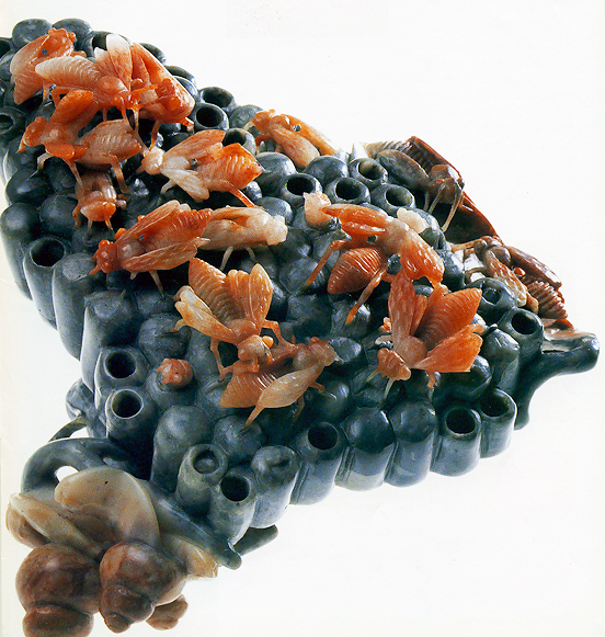 色の違う層を彫り分けてさまざまな工芸品が作られている青田石である。この蜂の巣も同じ1個の石塊で作られ、淡赤色の部分でハチ、