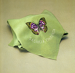 ぼくは“描かれた虫”は集めていないが、今回は例外。これはオオムラサキの雄を一隅に染めた縮緬の風呂敷で、