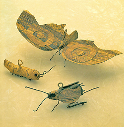 虫の背中の輪に紐を通し、このチョウ・いも虫・コオロギのほか、ガ・セミ・バッタなど10匹ほどの虫がジュズ繋ぎになっていた。