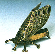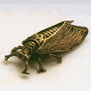 フランスはアールヌーボー期のもので、翅が上に開き腹部がマッチ入れになっている(写真)。これが作られたのもまた南仏のセミ好き(シリーズNo.22参照)の財産であろう。全長11.5cm。