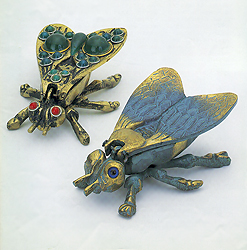 これらの蝿も翅を持ち上げると腹部が小物入れになっている。左下のシンプルな方は、1994年秋、柏市のデパートでの採集品で「ギリシャ製」のシールが貼ってある。