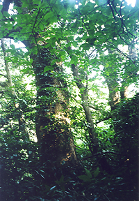 六合目から山頂近くまでの南東斜面を主に原生林が形成されていて、3,000本あり、そのうち600本は樹齢300年以上。ここがクスノキ林の北限とされる。