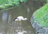 目の周りや喉の皮膚が裸出した部分と長い脚は赤色。尾は白いが、翼をたたむと黒い風切羽にかくれる。コウノトリ科。