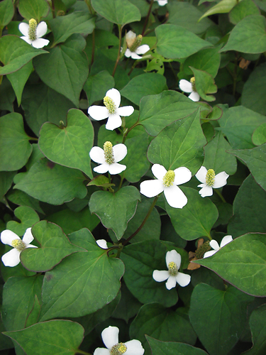 木の下などやや湿ったところに密生し、単一の群落を作る。春の花と夏の花の切れ目の6月に白い大きな花をつける。