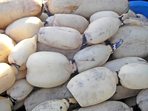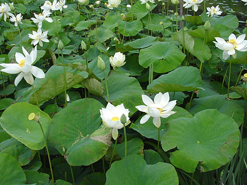 12月に入って寒くなってからレンコン掘りが始まる。霞ヶ浦周辺では耕耘機の発動機につないだポンプの力で水流を発生させてそれで掘る。 この冬はことのほか寒かった。いくら金になるとは言え、胸までのウエーダーを履いての作業はきつそうだ。私は大きなものより、 二次分枝した芽がついている小振りのレンコンが好きだ。柔らかくみずみずしく生で食べられるからだ。蓮田にはサンショウモ、オオアカウキクサ、 ミズアオイ、ミズオオバコなどの絶滅危惧種が生えるから何かと足が向いてしまう。仏教とともに世界各地に広まった湛水を好む多年生の植物。 |