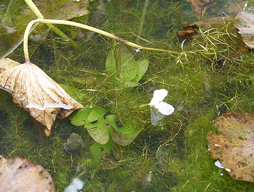 ミズオオバコは低質が泥で、流れの緩やかな小川や水田の浅水域に生育している。茨城県のレンコンを栽培している谷津田において、