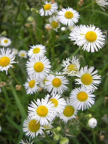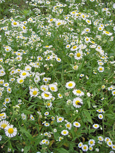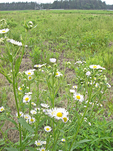 )と比べ、7月になって開花する夏の花である。花の形はよく似ているが、 ハルジオンは葉が茎を巻いているのと、つぼみが垂れているので区別できる。一年生の帰化植物で、荒れ地、庭、道路際などどこにでも生えている。