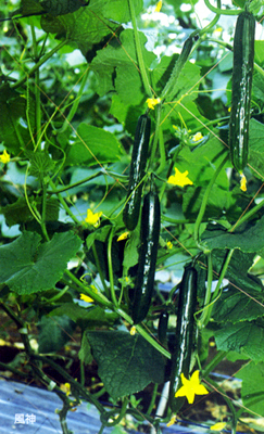ウドンコ病に強く、高温期になってもほとんど発生しません。側枝の雌花の連続性は強く、ほぼ1,2節とも連続して着きます。側枝の発生はよく、後半になっても枝の動きは良いです。果実は20〜21cmと規格に合い、機械選果に適する安定した円筒形をしています。果色は濃くて光沢があります。葉は小さくて角形をしています。