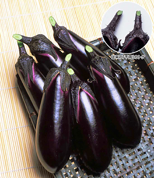 果実のヘタや茎葉など、植物体全てにトゲがない長卵形品種。トゲがないので、管理作業や収穫、袋詰めでの作業性の向上が見込め、ヘタのトゲによる荷傷み(傷果)が少なくなる。果形は太めの長卵形で、低温期でも果実の太りがよいので、「千両」と同様、ハウス栽培を中心に幅広い作型に適する。収穫果の秀品率が高く、果色は濃黒紫色でツヤがよい。果皮はやわらかく、炒め物や煮物、焼きナス、漬物などに適し、用途の幅が広い。極早生で節間は中程度。草勢は「千両」よりややおとなしいので、草勢維持に注意が必要。