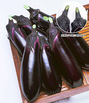 果実のヘタや茎葉など、植物体全てにトゲがない長卵形品種。トゲがないので、管理作業や収穫、袋詰めでの作業性の向上が見込め、ヘタのトゲによる荷傷み(傷果)が少なくなる。果形は長卵形で、果ぞろいがよく、秀品率が高い。果色は濃黒紫色で、ツヤがよく、色ボケ果の発生が少ない。果皮はやわらかで品質がよく、炒め物や煮物、焼きナス、漬物などに適し、用途の幅が広い。節間はやや長め。「千両二号」と同様、極早生で、夏秋栽培を中心に幅広い作型に適する。草勢は「千両二号」よりややおとなしいので、草勢維持に注意が必要。