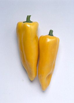 牛角形の果形で、サイズは120g前後。果肉は中厚で、適度な大きさの輪切りを多くとることができる。家庭向けから業務用まで用途が豊富。完熟果はビタミンCや機能性成分のルテインを豊富に含む。糖度は6〜7度で食味がよく、未熟果でも青臭みが少なく食べやすいので、青切り出荷も可能。熟期は極早生で初期から収量が上がる。開花後50〜60日で黄色の完熟果が収穫できる。着果がよく草勢はややおとなしくて栽培しやすい。TMV、ToMV)およびPMMoV-L3型耐病性。