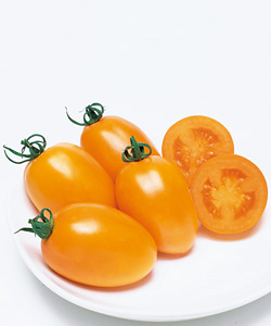 ●生食・調理用トマト。卵形の果実で果肉が厚く、生食はもちろん、調理用にも適する今までになかった橙黄色の卵形トマト。