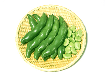 2.莢はやや長く濃緑。3粒莢主体であるが4粒莢も比較的多い。むき実の色は極濃緑な一寸ソラマメ。ゆで上がりの色がよく食味もよい。
