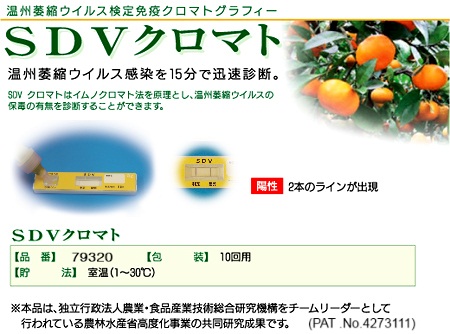 SDVクロマトはイムノクロマト法を原理とし、温州萎縮ウイルスの保毒の有無を診断することができます。