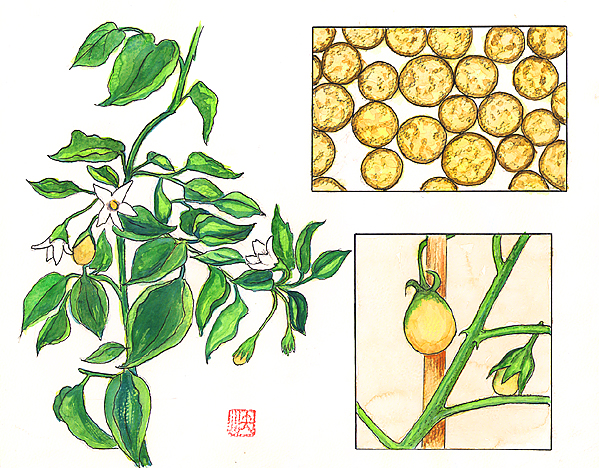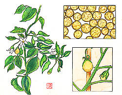 プロトプラスト(右上)ができて、はじめてポマト (左・右下は実)が誕生した 【絵:後藤 泱子】