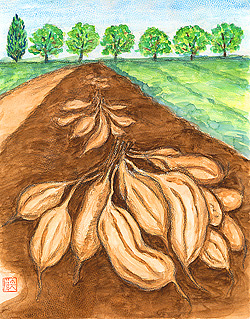 肥えた畑のコガネセンガンは1株で30キロ以上のイモをつける 【絵:後藤 泱子】