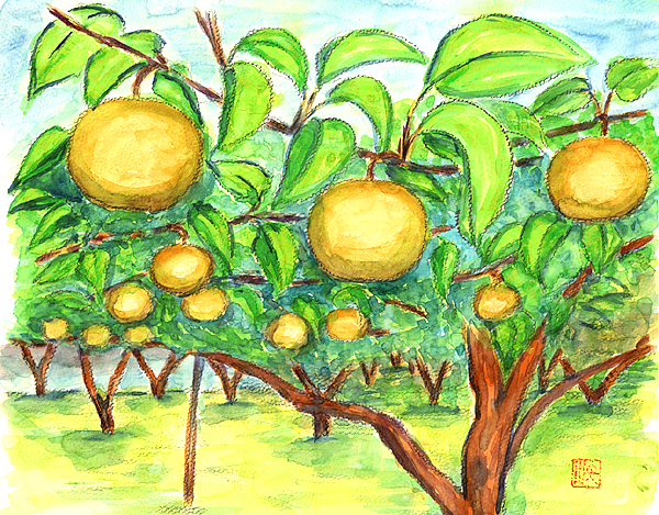 ナシの「幸水」は「新水」「豊水」と続くおいしいナシ 「三水」の先駆でもある 【絵:後藤 泱子】