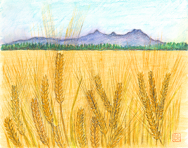 「はるな二条」が育成された新田試験地からは 榛名山がはるかに見える 【絵:後藤 泱子】