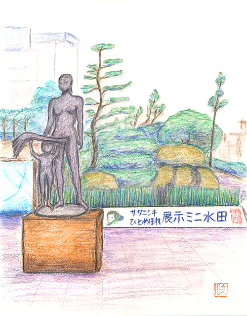 古川駅前に建つササニシキ顕彰碑。 傍らにササニシキ・ひとめぼれのミニ水田が並ぶ 【絵:後藤 泱子】