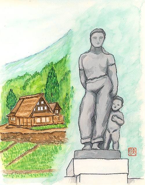 平村郷土館前に立つ鉢蝋清香の顕彰碑と同村風景 【絵:後藤 泱子】
