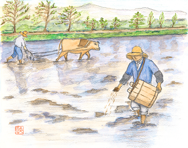 昭和20年代の代かき風景。 全層施肥はこの時代さかんに奨励された 【絵:後藤 泱子】