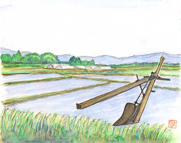 馬耕用の持立犂と亀治が「亀の尾」を選抜した 水田の現況(余目町小出新田) 【絵:後藤 泱子】