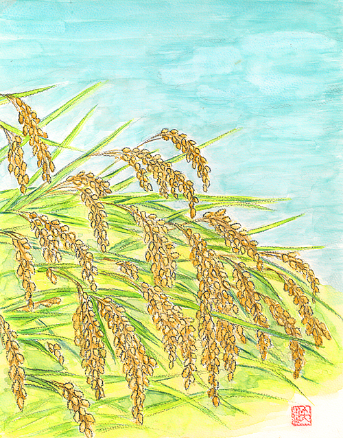 澄みわたった秋空に「日本晴」の穂波が揺れる 【絵:後藤 泱子】